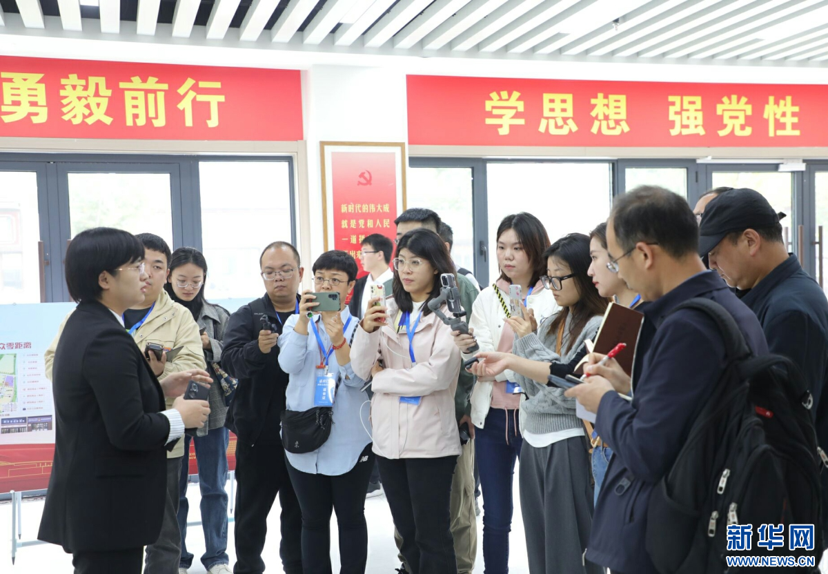 南文营社区党支部书记王伟肖接受采访团采访。新华网 王立鹏摄