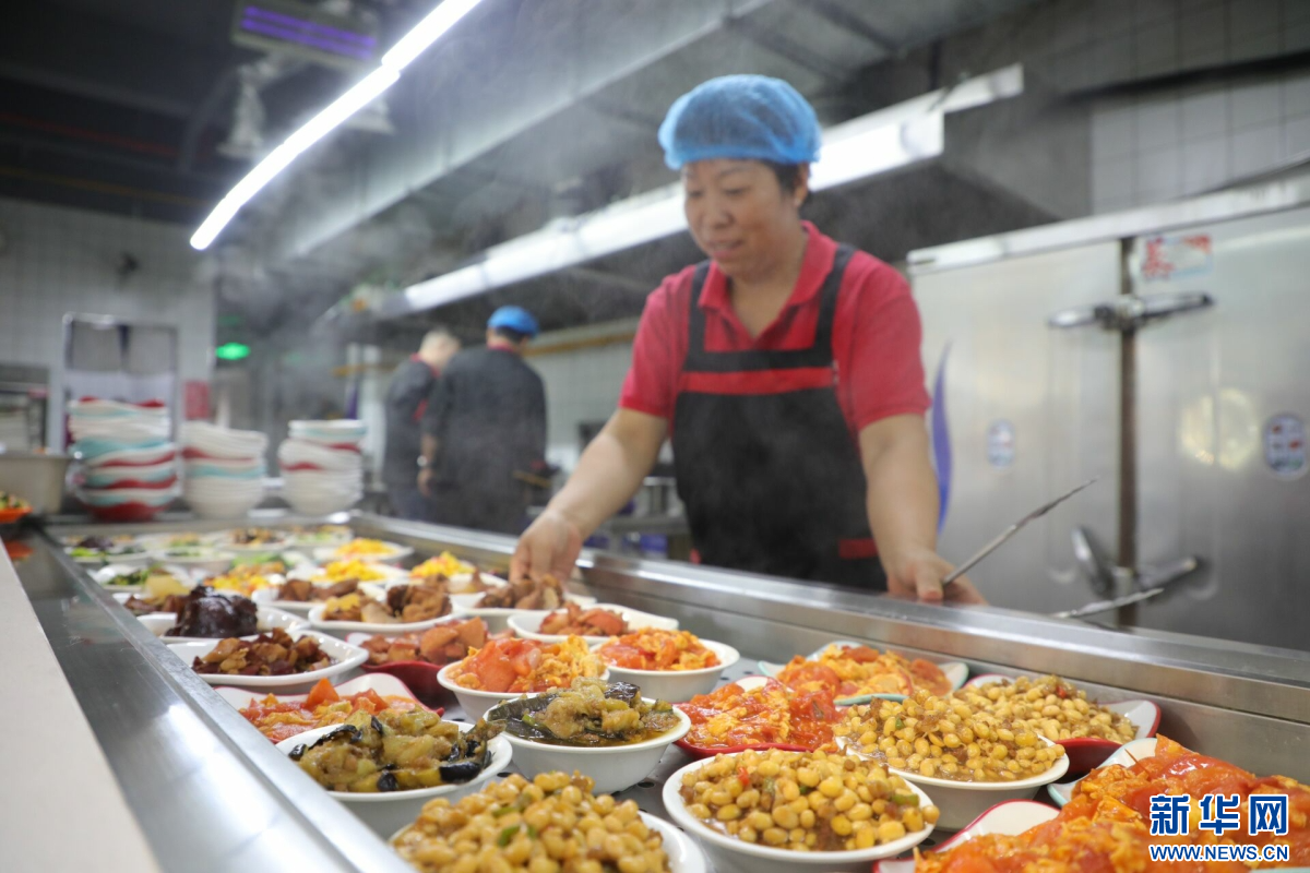 在南文营社区食堂,工作人员正在摆放当餐的菜品。新华网 王立鹏摄