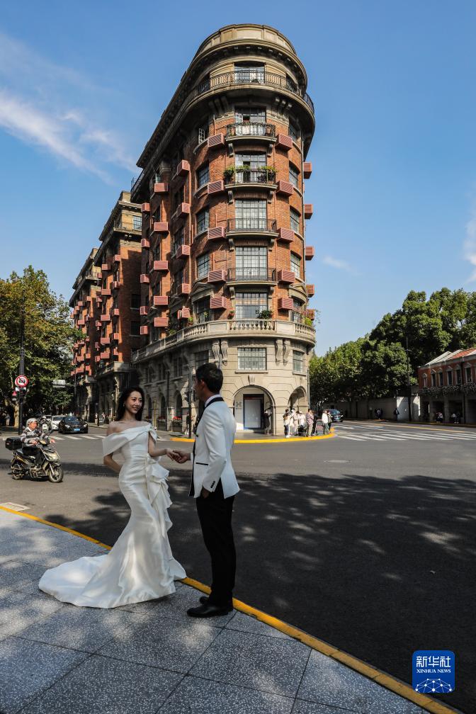 11月3日,人们在武康大楼前拍摄婚纱照。