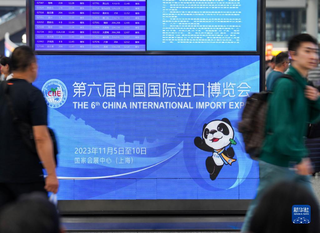 11月3日,旅客在上海虹桥火车站内路过第六届进博会海报。