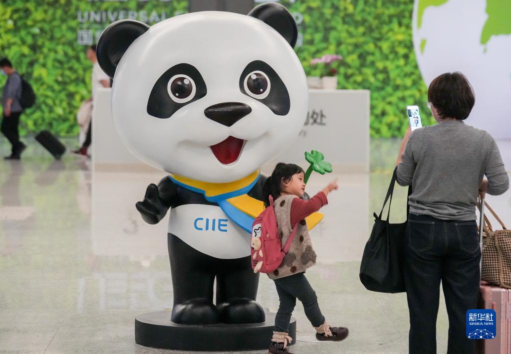 11月3日,旅客在上海虹桥机场2号航站楼内与“进宝”合影。