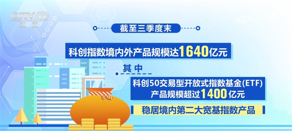 数据显示,截至三季度末,科创指数境内外产品规模达1640亿元,其中,科创50交易型开放式指数基金(ETF)产品规模超过1400亿元,稳居境内第二大宽基指数产品。