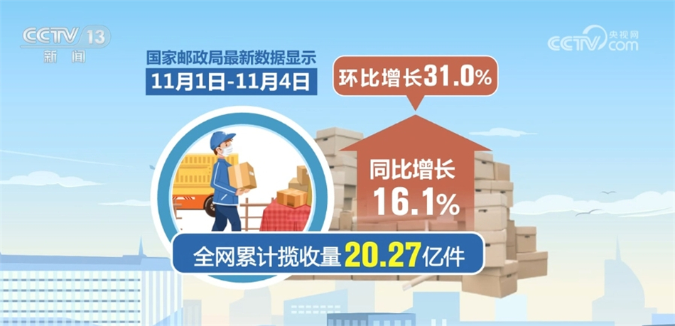 国家邮政局最新数据显示,11月1日—11月4日,全网累计揽收量20.27亿件,同比增长16.1%,环比增长31.0%。