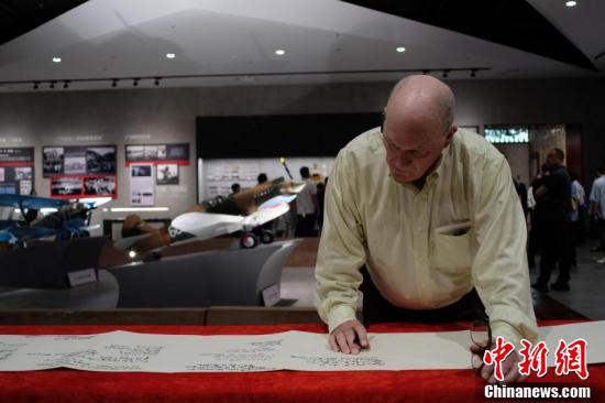 飞虎队老兵克利福德·隆之子小克利福德·隆,则随身带着父亲的旧照。他回忆道,父亲飞行技艺高超,在低空飞掠时,当地的中国民众能近距离看到他圆圆的脸蛋,遂给他起了“月亮脸”的可爱绰号。图为飞虎队老兵克利福德·隆之子小克利福德·隆在集体签名纸上签下自己的姓名。