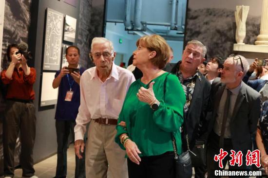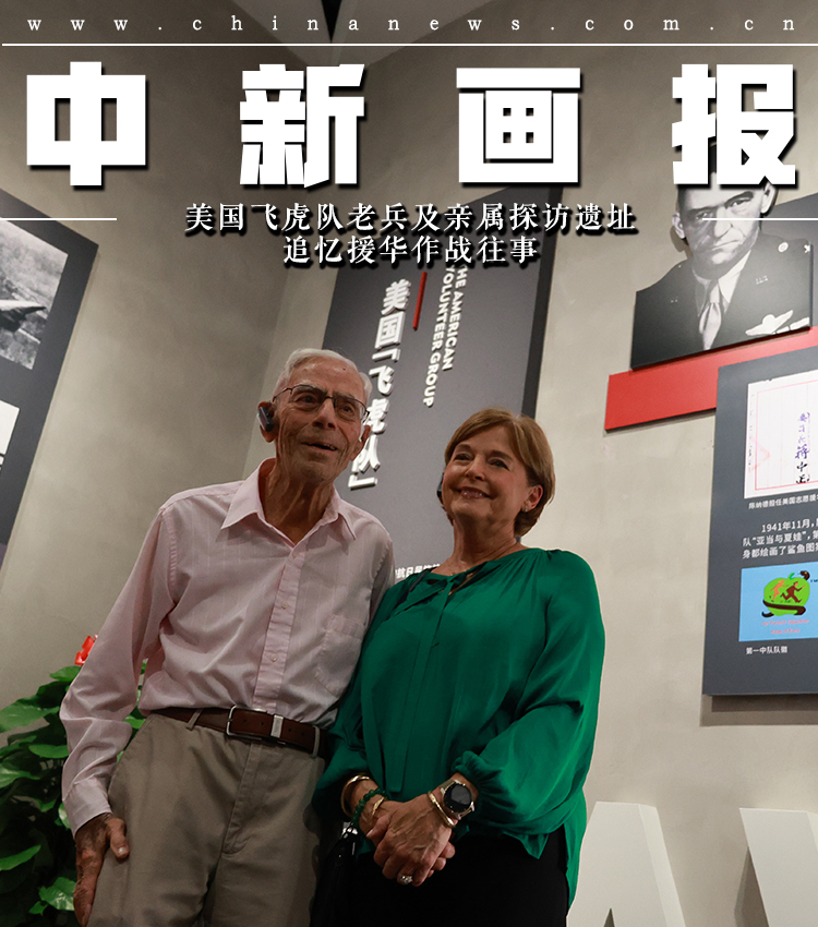 飞虎队老兵及后代在园区看到飞虎队遗址和相关照片、物件,不由睹物思情。美国飞虎队指挥官陈纳德将军的外孙女嘉兰惠,看到祖父的旧照时激动不已,提出要与其旧照合影留念,并表示自己为祖父感到骄傲。图为飞虎队老兵哈里·莫耶(左)与陈纳德将军外孙女嘉兰惠(右)正在参观展馆。