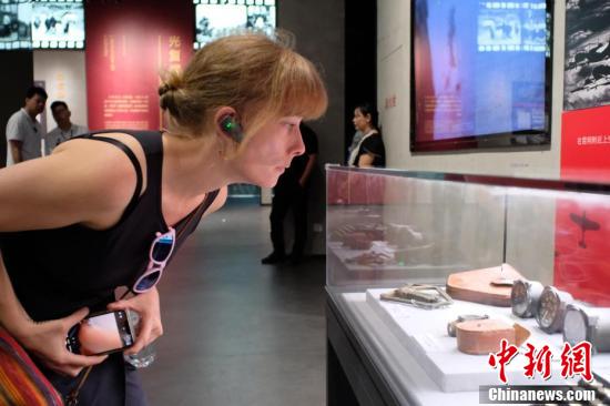 图为一名飞虎队老兵亲属正在仔细端详藏品。