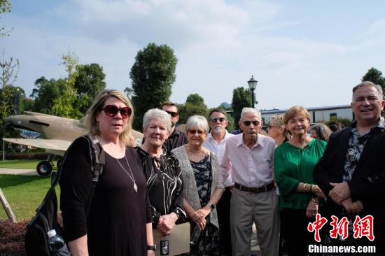 图为飞虎队老兵克利福德·隆之子小克利福德·隆(中)在飞机前介绍父亲的故事。