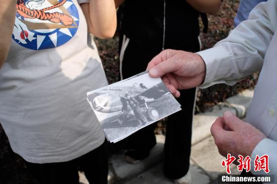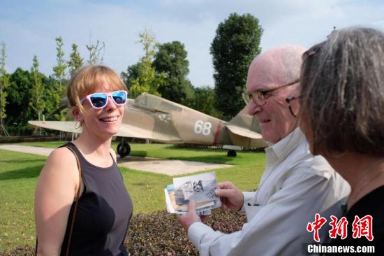 11月4日,美中航空遗产基金会主席杰弗里·格林率飞虎队老兵哈里·莫耶及飞虎队亲属来到广西柳州市军事博物园,在曾经的飞虎队遗址共同追忆援华作战往事。图为嘉兰惠看到祖父的旧照(右上角)时激动不已,提出要与其旧照合影,并表示自己为祖父感到骄傲。