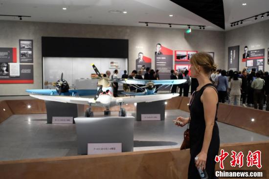 图为一名飞虎队老兵亲属从一架飞机模型前走过。