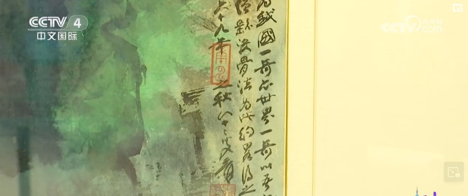 总台央视记者 孙雨彤:这幅作品就是由张大千在1980年创作的《阿里山晓色》。张大千曾以“阿里山”为题材,创作出两帧四尺整纸横幅,这就是其中一件。画上有题款“嘉义阿里山晓色为我国一奇,亦世界一奇”。