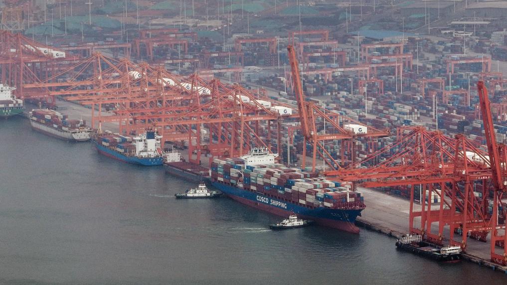 10月26日,在钦州港集装箱装卸码头,海事船正在协助海轮离岸(无人机照片)。新华社记者 张爱林 摄
