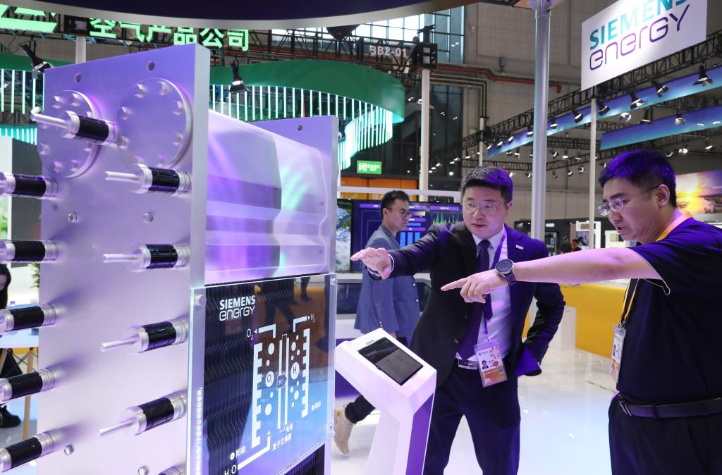11月5日,工作人员(左)介绍第六届进博会西门子公司展出的电解水制氢装置模型。新华社记者 方喆 摄
