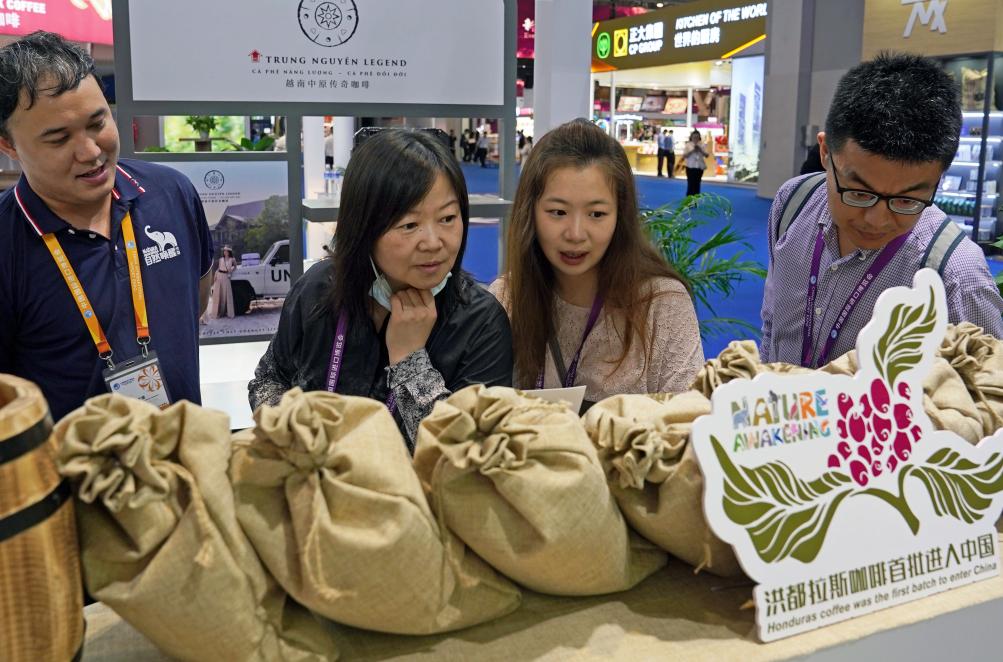 11月5日,观众在第六届进博会食品及农产品展区参观首次亮相中国的洪都拉斯咖啡豆。新华社记者 刘颖 摄