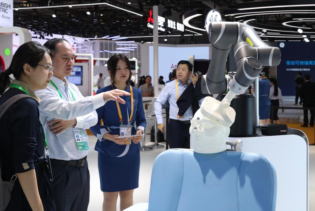 11月5日,参观者在第六届进博会欧姆龙公司展出的黑海豚靶向磁刺激机器人展品旁交流。新华社记者 方喆 摄