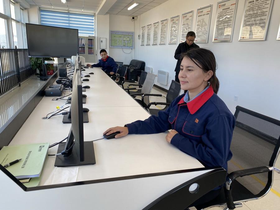 深能福塔光伏电站运维工程师夏热瓦娜·买日完江正在工作。(中国网记者 王冉 摄)