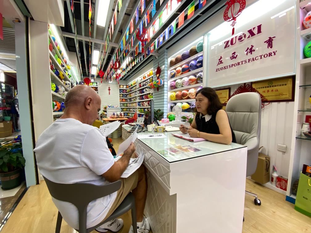 义乌国际商贸城内,经营户正在与国外客户洽谈。新华社记者魏一骏 摄