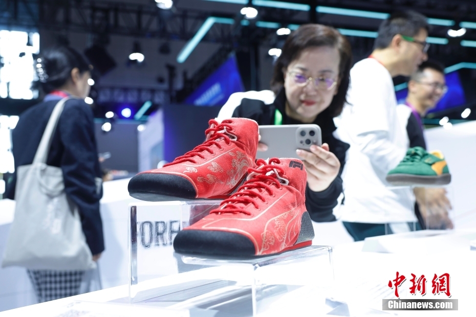 在第六届中国国际进口博览会消费品展区彪马展台上,观众在拍摄为F1中国站定制的赛车鞋。据悉,此款专业赛车鞋以Speedcat Pro为蓝本,特别融入中国传统而古老的龙图腾。