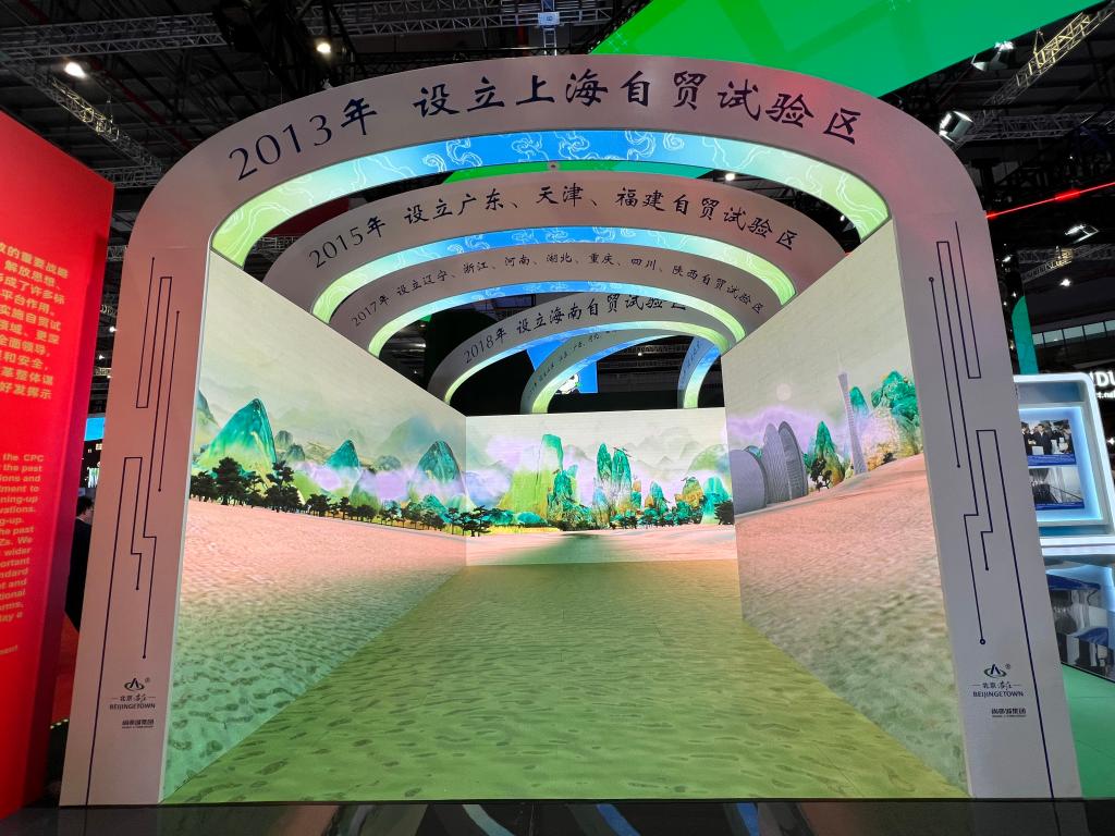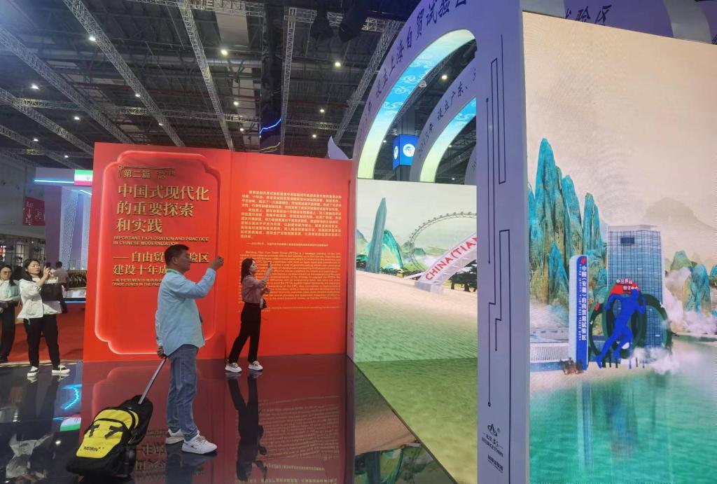 这是正在国家会展中心(上海)举办的第六届中国国际进口博览会国家综合展的一个特别部分“中国式现代化的重要探索和实践——自由贸易试验区建设十年成就展”。它位于中国国家馆内,通过高清视频、珍贵照片、实物模型等,讲述中国各地自贸试验区建设的改革开放故事。