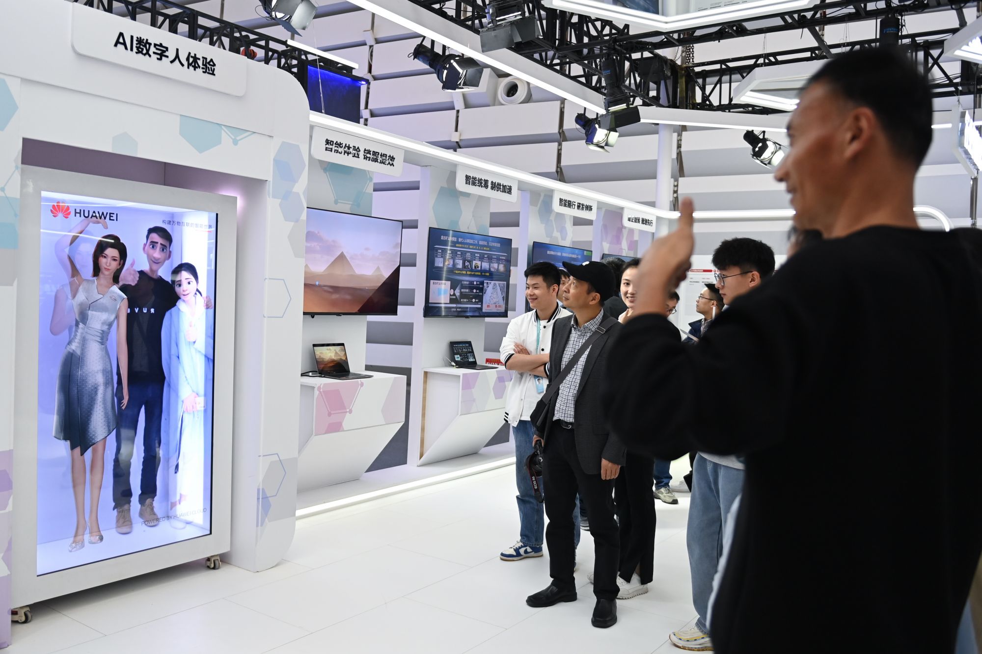 观众在华为展台体验与AI数字人合影。新华社记者 黄宗治 摄