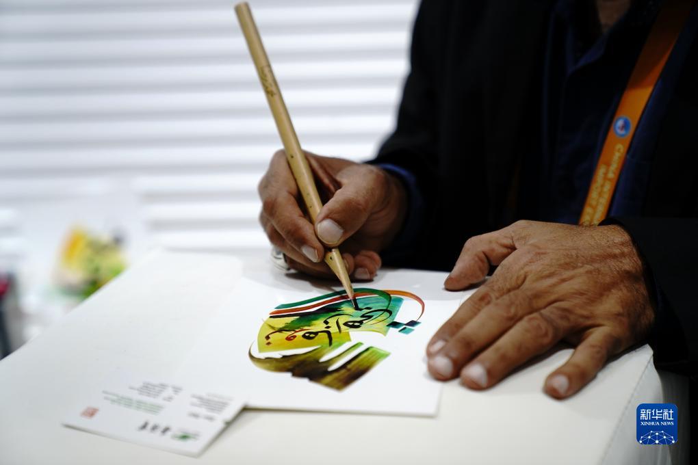 11月7日,在第六届进博会国家展区,一位巴林王国的艺术家用阿拉伯文为观众书写姓名。
