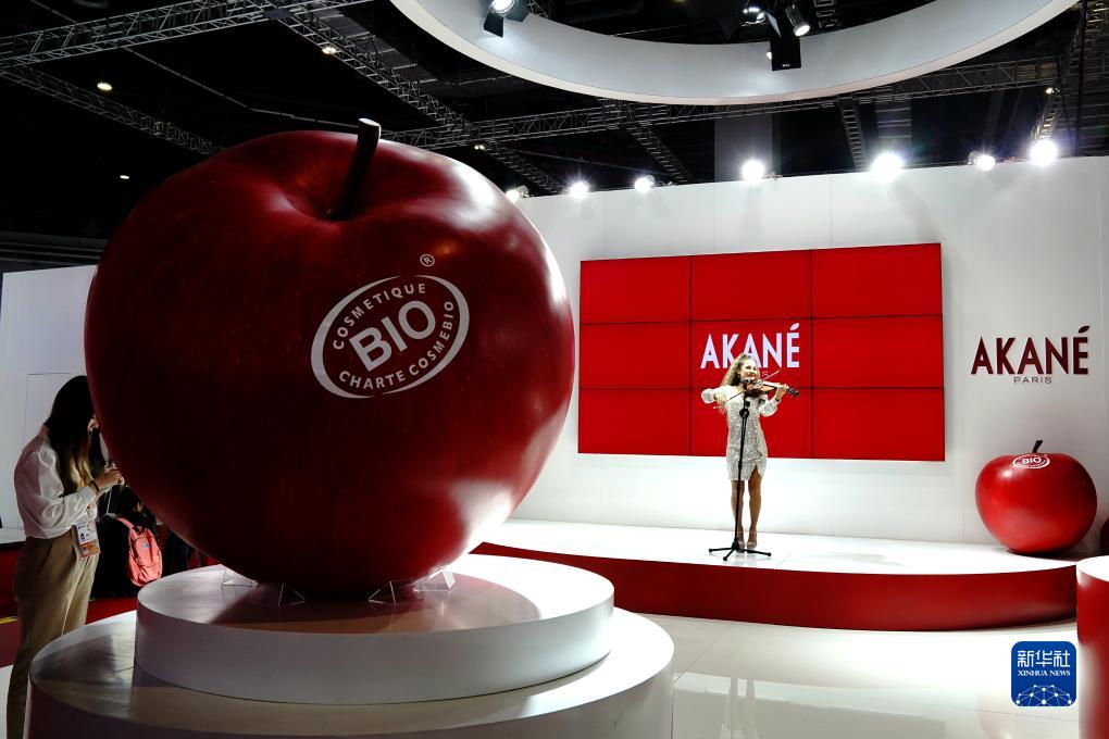 11月7日,在第六届进博会消费品展区,演员在化妆品AKANE展台上进行小提琴表演。