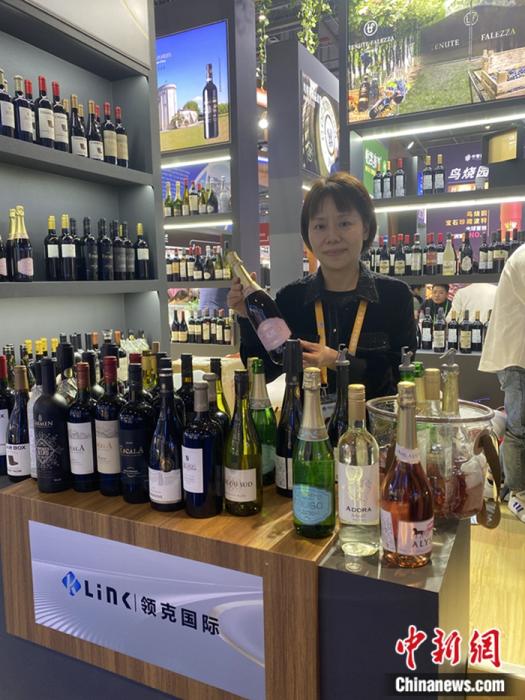 11月9日,展台工作人员张春睿在第六届进博会上展示脱醇葡萄酒。王梦瑶 摄