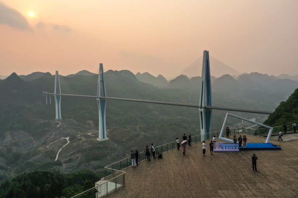 游客在贵州平罗高速公路“天空之桥”观光服务区观景台观赏平塘特大桥(2023年4月13日摄,无人机照片)。新华社记者 杨文斌 摄