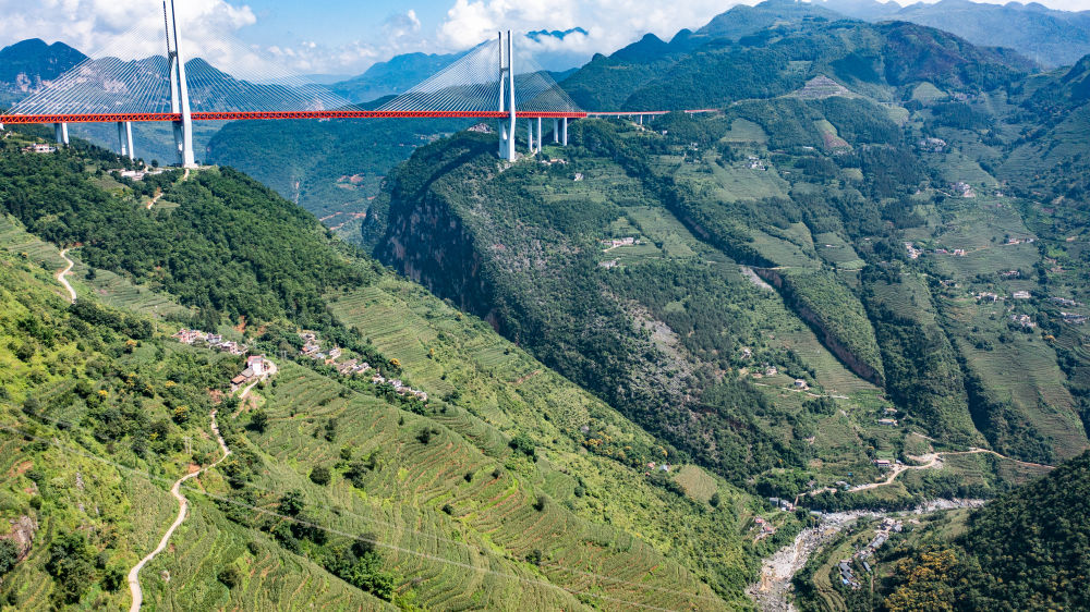 贵州、云南交界处的杭瑞高速北盘江大桥(2023年8月16日摄,无人机照片)。新华社记者 陶亮 摄