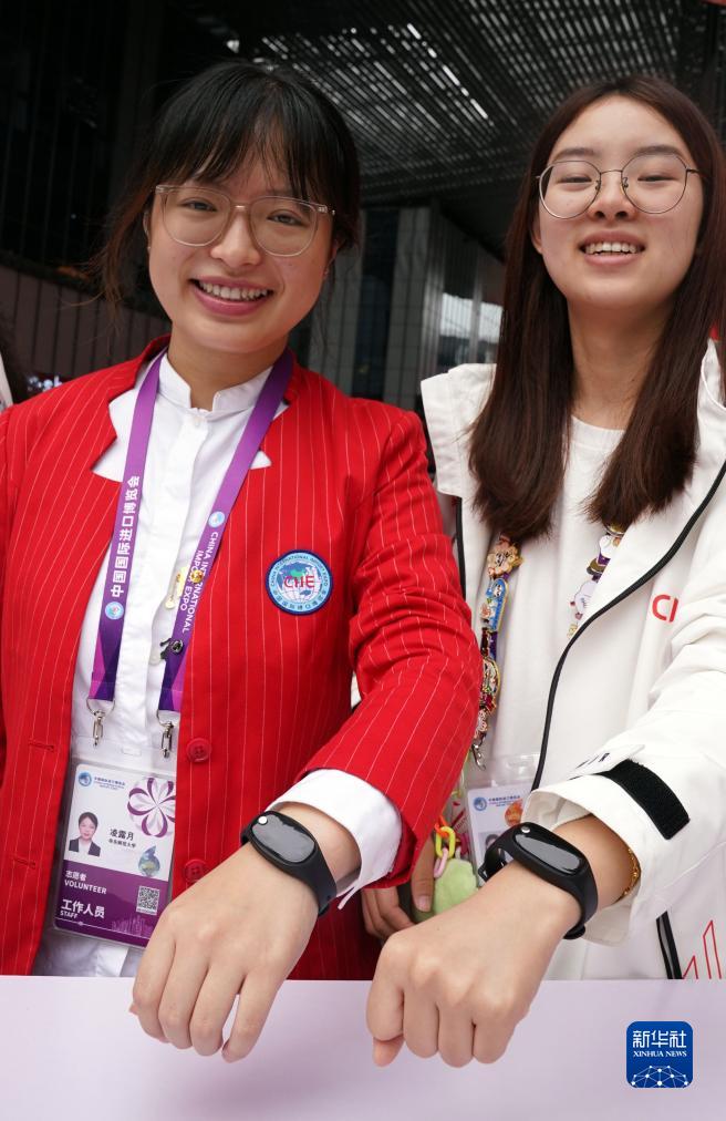 11月9日,志愿者展示服务保障组为“小叶子”们配发的数字化管理终端(智能手环)。该平台依托智能手环,通过动态监测和可视化显示,对志愿者进行数字化管理,为志愿者提供精心保障。新华社记者 刘颖 摄