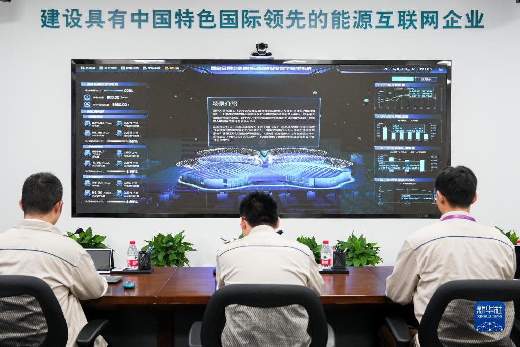 11月9日,国网上海青浦供电公司的工作人员在中国国际进口博览会供电服务现场指挥中心内工作。第六届进博会首次实现全绿电办展。新华社记者 丁汀 摄