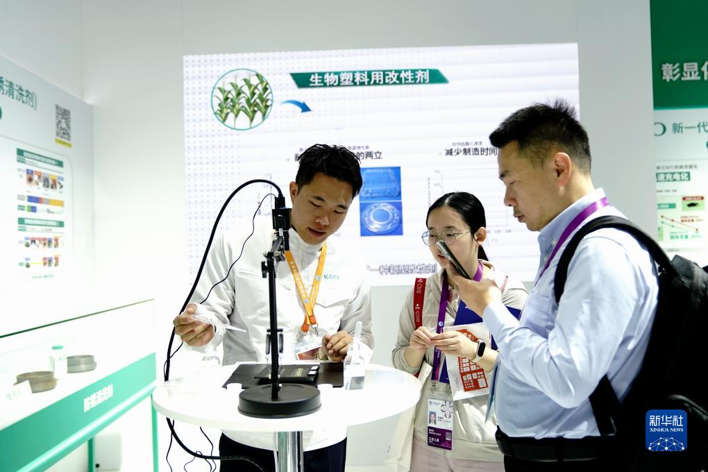 11月9日,在消费品展区花王展台,工作人员向观众演示环保产品“生物塑料用改性剂”的效果。新华社记者 张建松 摄