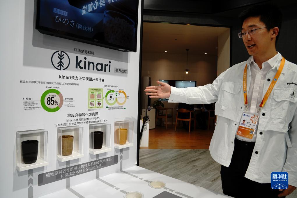 11月9日,在消费品展区松下展台,工作人员介绍利用植物废弃物转化的纤维生态材料。新华社记者 张建松 摄