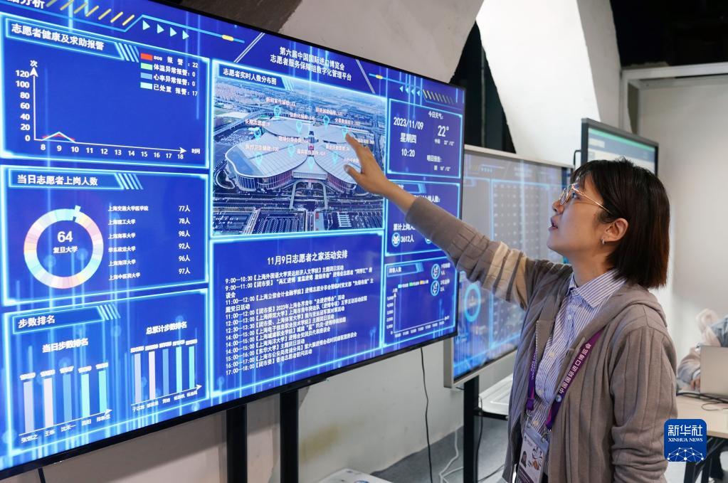 11月9日,工作人员在介绍第六届进博会志愿者服务保障组数字化管理平台。该平台依托智能手环,通过动态监测和可视化显示,对志愿者进行数字化管理,为志愿者提供精心保障。新华社记者 刘颖 摄
