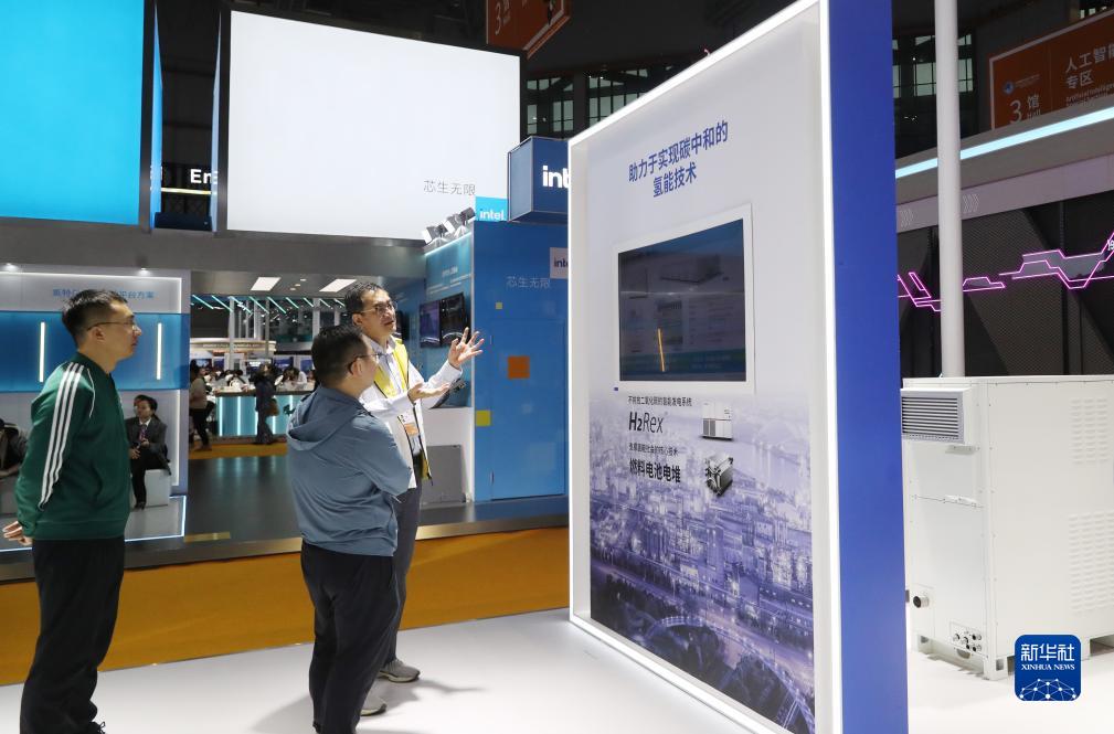 11月9日,一名工作人员(右)在东芝公司展台向参观者介绍公司的氢能技术应用信息。新华社记者 方喆 摄