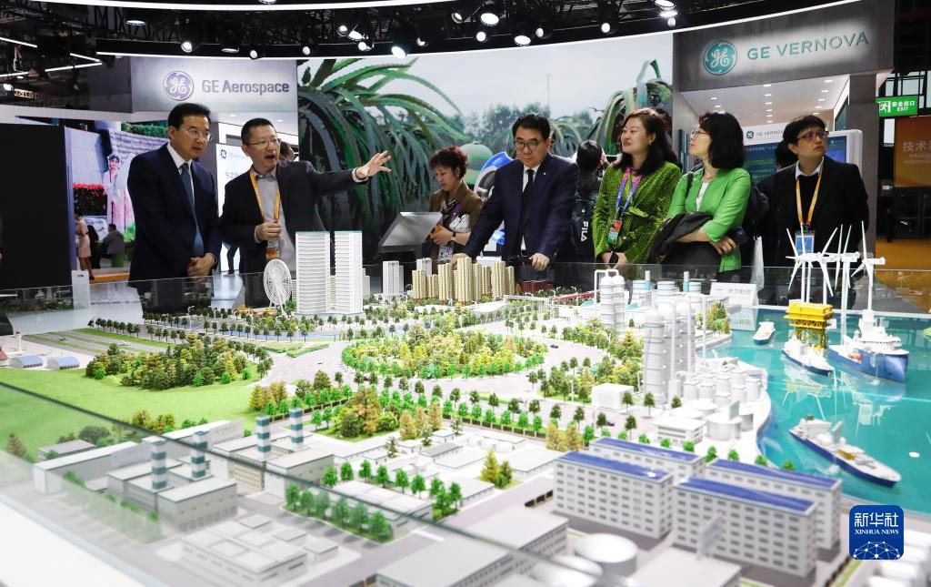 11月9日,参观者在GE公司能源转型全产业链解决方案模型演示沙盘旁交流讨论。新华社记者 方喆 摄