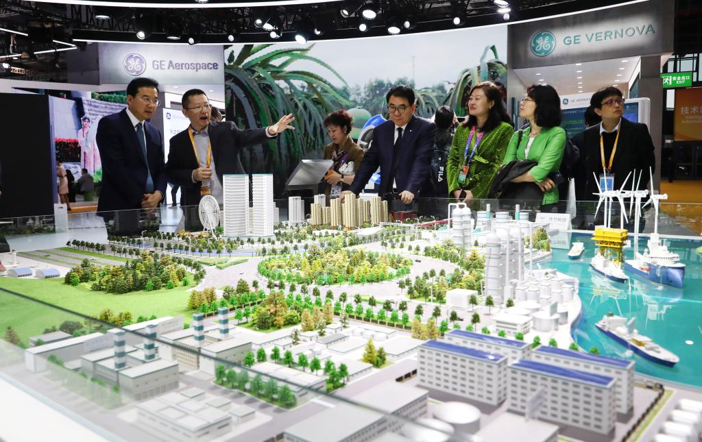 11月9日,参观者在GE公司能源转型全产业链解决方案模型演示沙盘旁交流讨论。(新华社记者方喆摄)