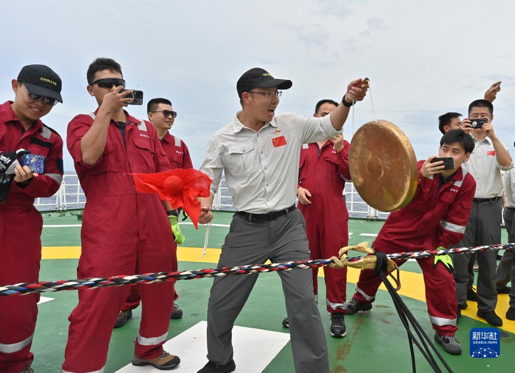 11月10日,中国第40次南极考察队在“雪龙2”号上举行穿越赤道纪念活动。图为考察队副领队魏福海敲锣宣布拔河比赛开始。新华社记者 周圆 摄