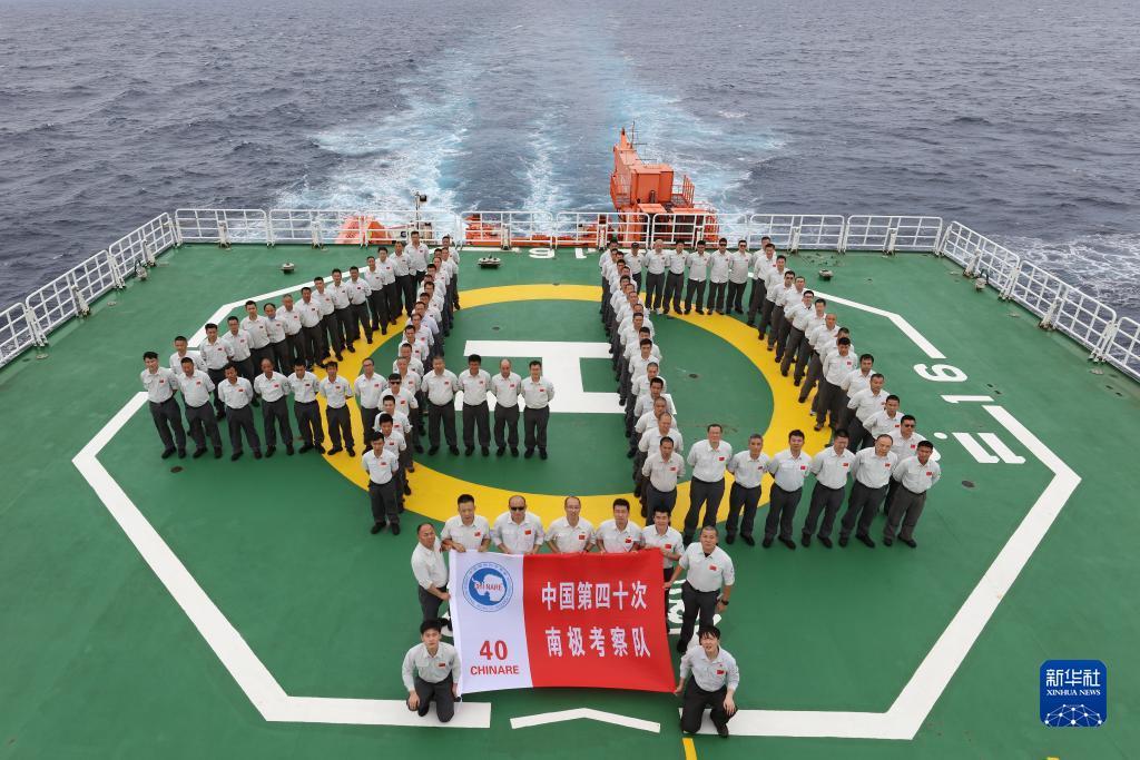 11月10日,中国第40次南极考察队在“雪龙2”号上排列成“40”字样的队形合影留念。新华社记者 周圆 摄