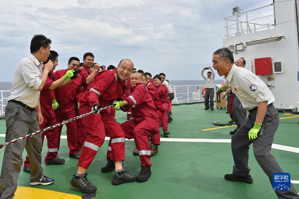 11月10日,中国第40次南极考察队在“雪龙2”号上举行穿越赤道纪念活动。图为队员参加拔河比赛。新华社记者 周圆 摄