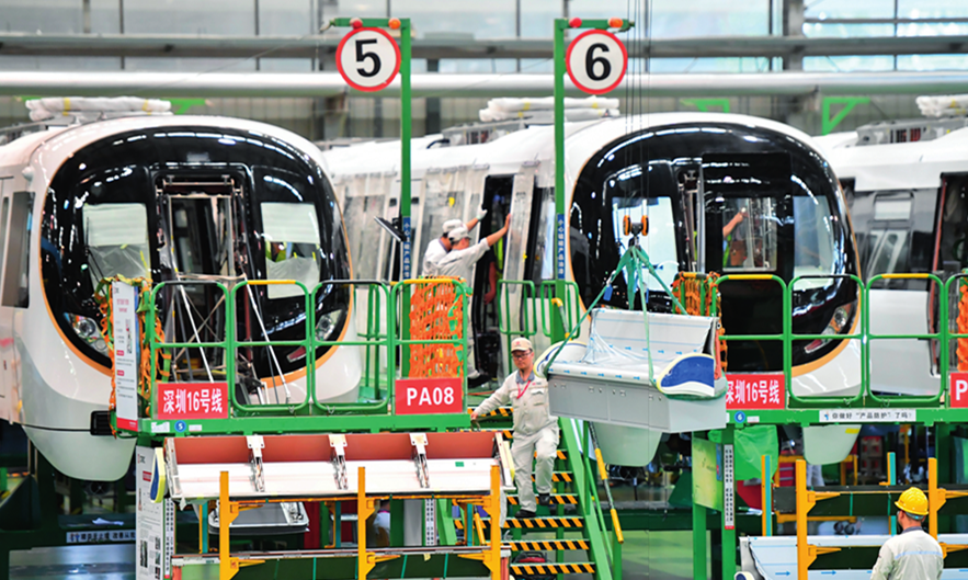 在中车株洲电力机车有限公司城轨事业部总成车间,工人在生产线上作业(2022年7月5日摄)。陈泽国摄/本刊
