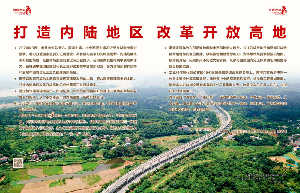 ◇2020年9月,中共中央总书记、国家主席、中央军委主席习近平在湖南考察时强调,着力打造国家重要先进制造业、具有核心竞争力的科技创新、内陆地区改革开放的高地,在推动高质量发展上闯出新路子,在构建新发展格局中展现新作为,在推动中部地区崛起和长江经济带发展中彰显新担当,奋力谱写新时代坚持和发展中国特色社会主义的湖南新篇章。
