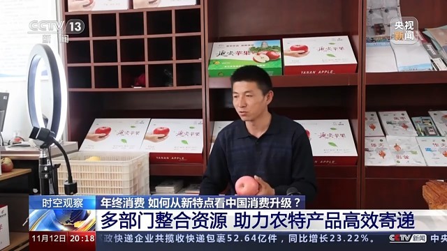 在陕西甘泉县劳山乡,果农王周周正在自家的直播间售卖苹果,随着可直发全国的县级物流园的投入运行,今年他家的苹果快递到了更远的地方。