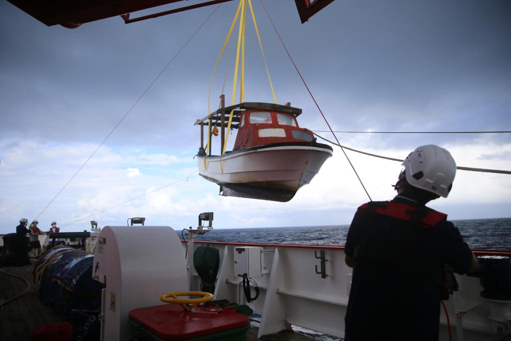 绑绳、挂钩、起吊,求救船只一点点离开海面。前后两条带缆平时只需两三人,这次考察队不少队员都来帮忙,一条带缆5人使劲。