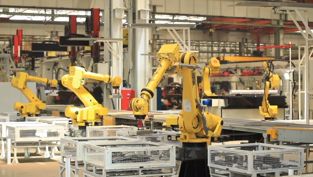 在三一重工长沙园区的18号工厂厂区内,工业机器人正在工作。(视频截图)