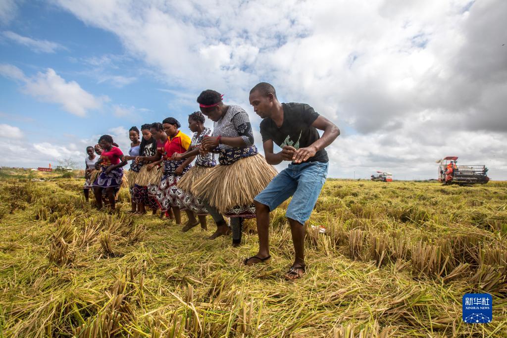 在莫桑比克万宝莫桑农业园,农户在水稻收割现场载歌载舞庆祝丰收(2019年4月7日摄)。万宝莫桑农业园是中国在非洲最大规模水稻种植项目,极大地缓解了莫桑比克粮食短缺问题。