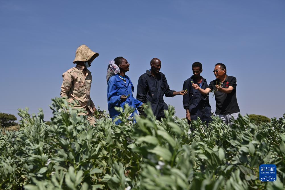 在位于厄立特里亚阿斯马拉的农业技术援助项目示范地,中国援厄第三期高级农业专家组豆类作物专家刘运民(右一)与当地农户交流(2023年9月27日摄)。为推动厄立特里亚农业产业发展,中国农业农村部已派出三批专家在厄立特里亚开展涉及豆类作物、果树园艺、油料等领域的技术援助工作,成效显著。