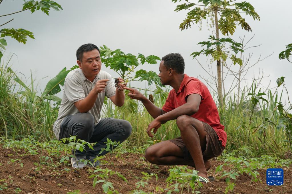 在圣多美和普林西比洛巴塔县卡德拉斯村,中国援圣普农牧业技术专家组专家许州达在田间指导农户努内斯种植辣椒(2023年7月15日摄)。中国援圣普农牧业技术专家组与圣普农业、渔业和农村发展部合作,于2021年在圣普洛巴塔县卡德拉斯村建立第一个中圣普农业减贫示范村,并有效结合中国农业技术和扶贫经验帮助当地农民增产增收。