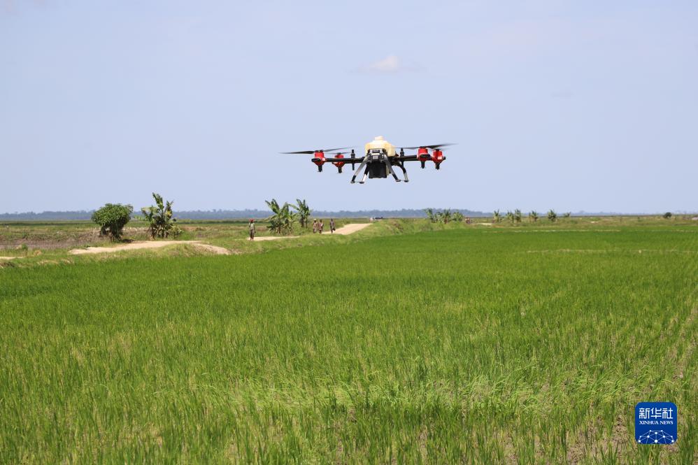 在乌干达卡隆古区卢卡亚镇中亿农业园,一架植保无人机进行喷洒农药作业(2021年6月2日摄)。2014年以来,乌干达卡隆古区卢卡亚镇的滩涂在中国企业的开发下已经变成万顷良田,并建起了现代化农场。