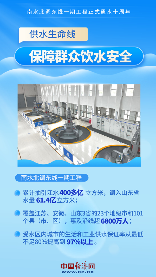 2013年11月15日,南水北调东线一期工程正式通水。通水10年来,东线一期工程累计抽引江水400多亿立方米,调入山东省水量61.4亿立方米,有效缓解了南水北调东线沿线受水区缺水问题,受益人口超6800万人,成为优化水资源配置、保障群众饮水安全、复苏河湖生态环境、畅通南北经济循环的生命线。