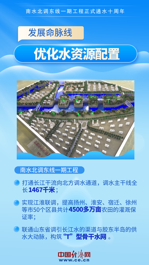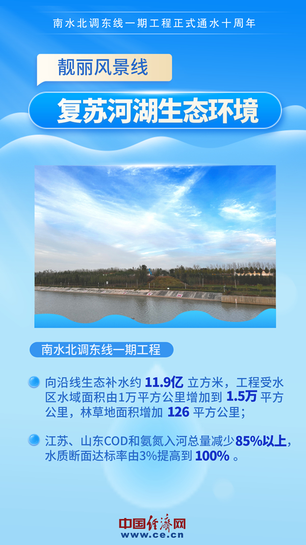 10年来,长江水、淮河水、黄河水等水系构筑起的纵横水网,由一渠清水串连,铺陈在东方大地上,连接起江苏、安徽、山东3省的23个地级市和其辖内的101个县(市、区)用水需求,惠及沿线超6800万人。